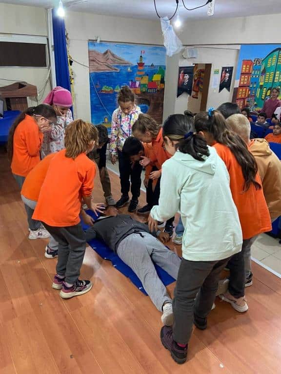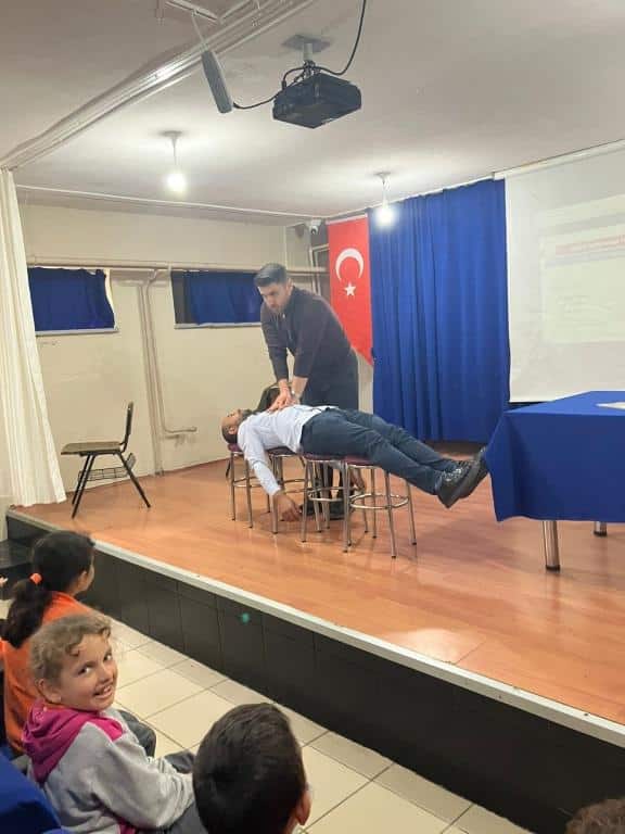 Dünya İlkyardım Günü münasebetiyle ilkyardım sertifikası bulunan okul rehber öğretmenimiz Ahmet YAVUZKURT ve sınıf öğretmenimiz Yusuf EKER; boğulma, kaza, zehirlenme, yaralanma gibi ani durumlarda tıbbi yardım gelene kadar kişiye nasıl müdahale edilmesi gerektiği konularında öğrenci, öğretmen, okul çalışanı, servis rehber personeli ve velilerimize gerekli eğitimleri verdiler. Öğretmenlerimize çok teşekkür ediyoruz.